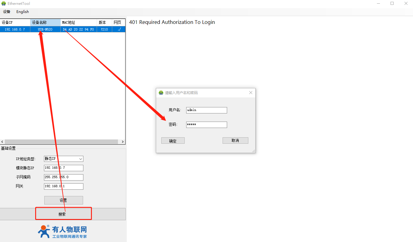 3)打開N520-H7設(shè)置軟件,搜索----雙擊選中設(shè)備----用戶名,密碼出廠默認(rèn)均為admin