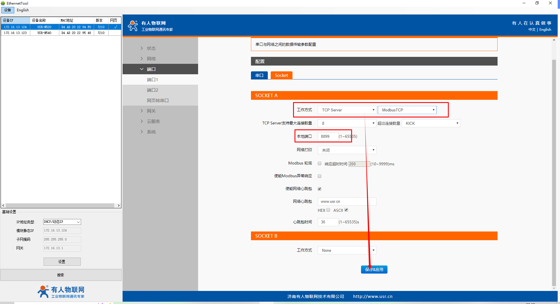 8)繼續(xù)在軟件中配置socket參數(shù),工作方式選擇tcp server,本地端口可自定義,啟用modbus tcp功能,其他參數(shù)保持默認(rèn),設(shè)置完成后點(diǎn)擊保存并應(yīng)用。全部參數(shù)設(shè)置完成后,點(diǎn)擊重啟。參數(shù)重啟后生效