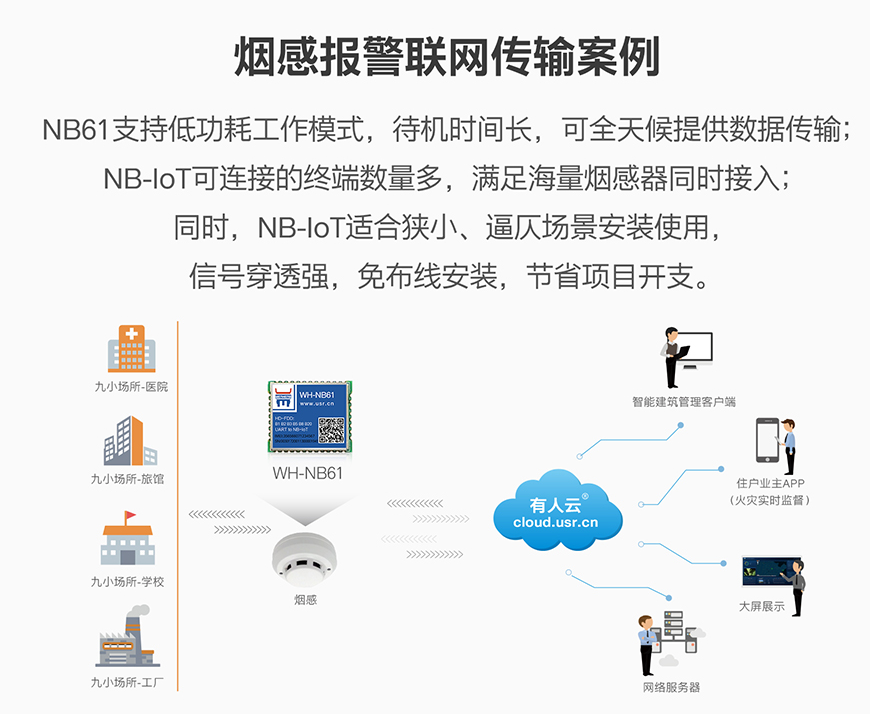 NB61支持低功耗工作模式,待機時間長,可全天候提供數據傳輸;NB-IOT可連接的終端數量多,滿足海量煙感器同時接入;同時NB-IOT適合狹小、逼仄場景安裝使用,信號穿透強,免布線安裝,節(jié)省項目開支