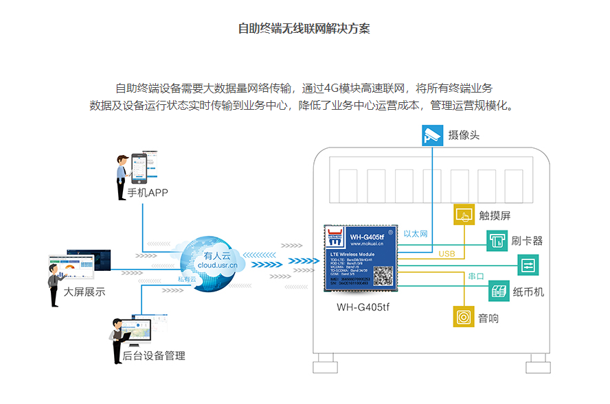 自助終端設備需要大數據量網絡傳輸,通過4G模塊高速聯網,將所有終端業(yè)務數據及設備運行狀態(tài)實時傳輸到業(yè)務中心,降低了業(yè)務中心運營成本,管理運營規(guī)?;?/span>