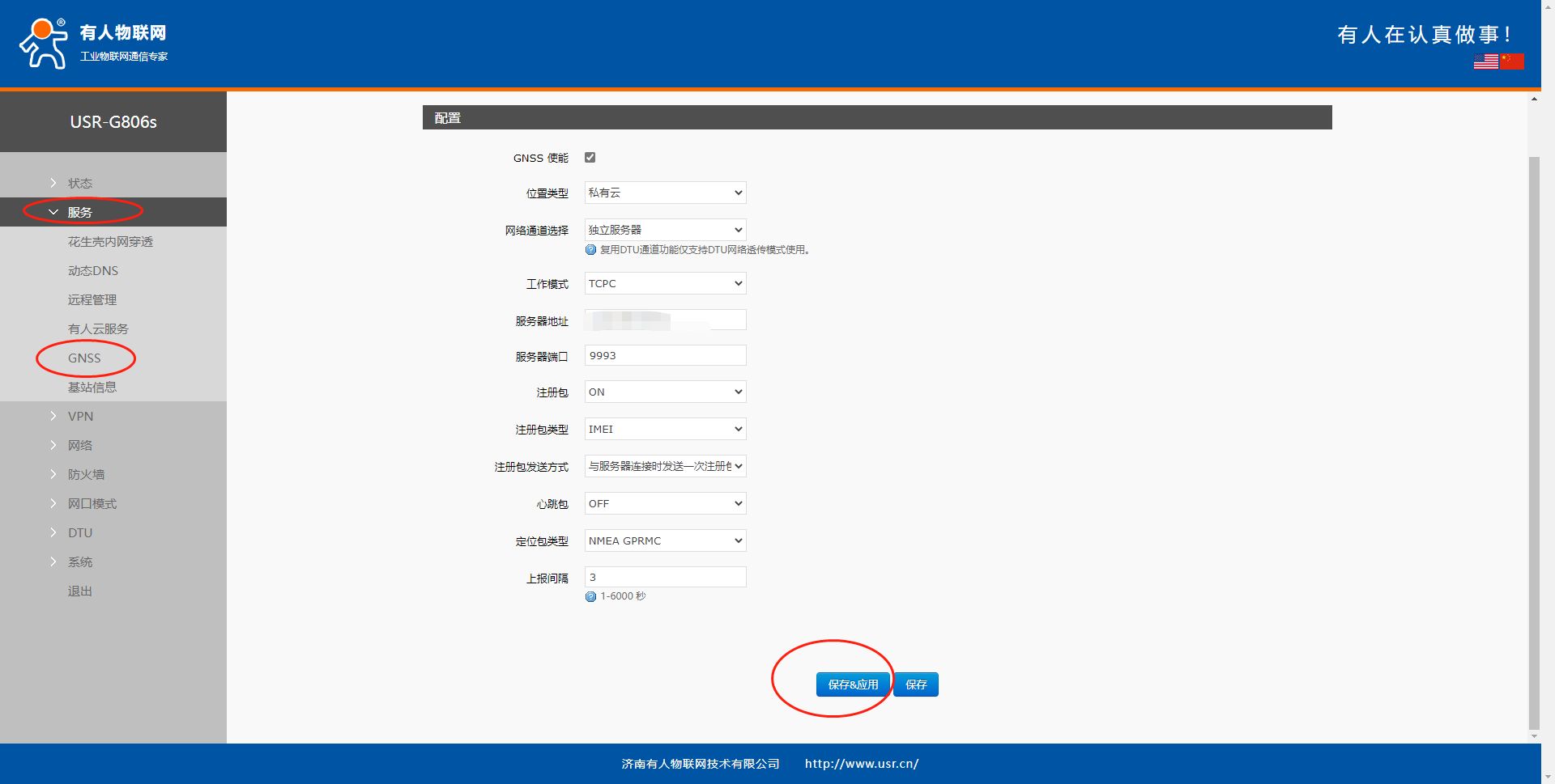 勾選GNSS使能,選擇私有云、獨(dú)立服務(wù)器,工作模式為TCPC,服務(wù)器地址和端口與私有服務(wù)器設(shè)置對應(yīng),注冊包和心跳包可不選,定位類型選擇NMEA GPRMC,上報時間在1-6000秒之間選擇。本次設(shè)置如下,設(shè)置完之后點(diǎn)擊保存&應(yīng)用。