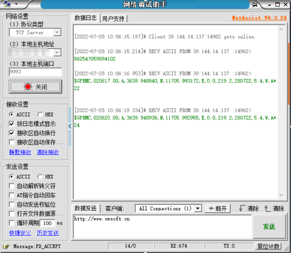 四、網(wǎng)絡(luò)調(diào)試助手點(diǎn)擊打開。因?yàn)樵O(shè)置了注冊包類型為IMEI且與服務(wù)器連接時發(fā)送一次注冊包,所以可以看到第一次連接是給服務(wù)器發(fā)送IMEI,之后三秒上報一次數(shù)據(jù)。