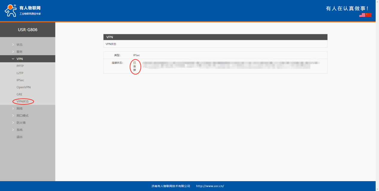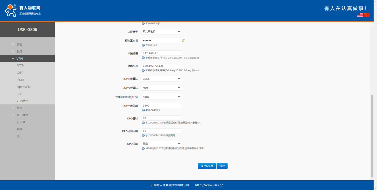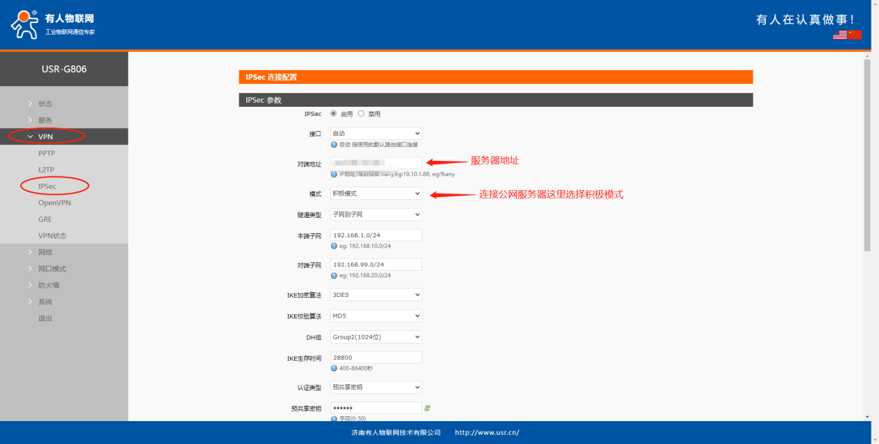 USR-G806:采用 4G 接口連接外網(wǎng),啟用IPsec連接 VPN。