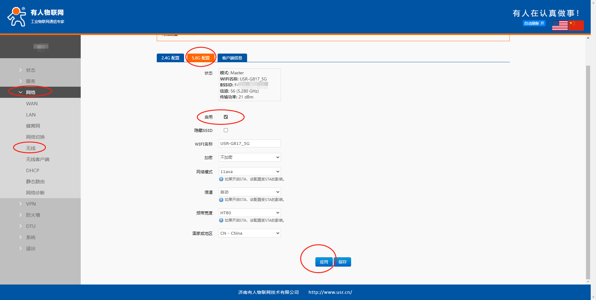 G817、G816w:網(wǎng)絡--無線--2.4G配置/5.8G配置--啟用(取消勾選)--應用
