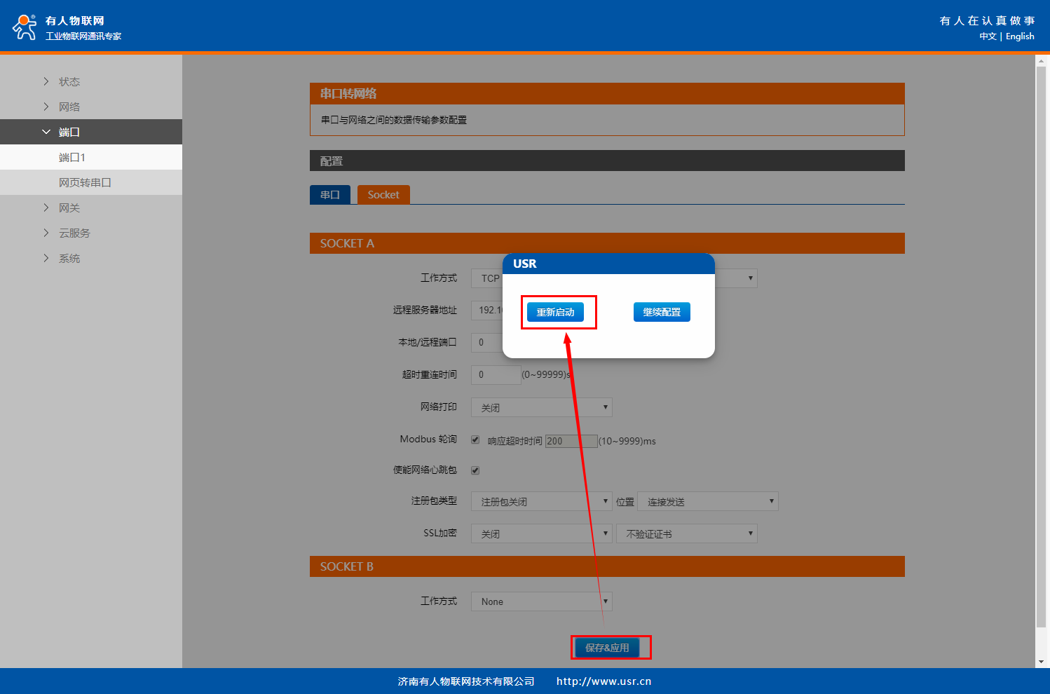 在“端口”>“端口1”界面中的“Socet”配置Socket A的工作模式為“TCP Client”