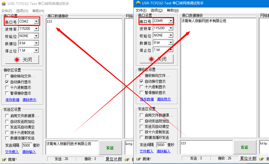 10、使用串口工具打開虛擬串口與N510真實串口,便可實現(xiàn)網(wǎng)絡(luò)串口與真實串口之間的相互通信。