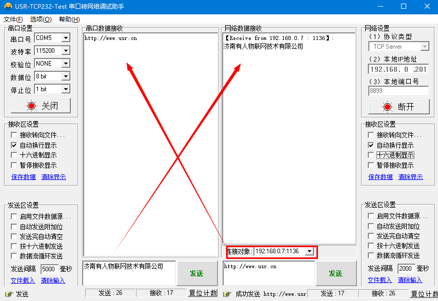 10、N510重啟后,軟件出現(xiàn)連接對象,串口與網(wǎng)絡(luò)便可互發(fā)數(shù)據(jù)。