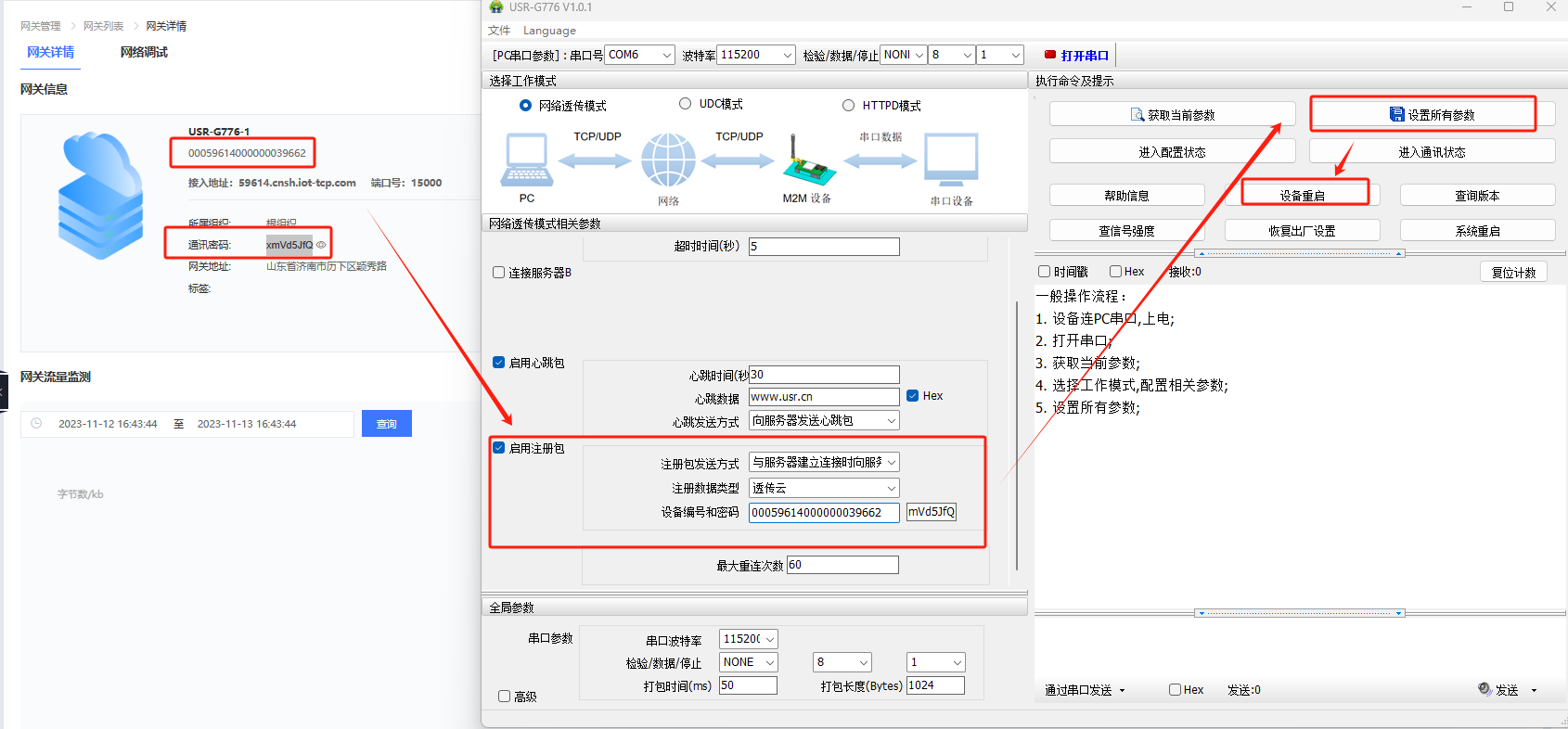 7、啟用注冊(cè)包,注冊(cè)包發(fā)送方式選擇為“與服務(wù)器連接時(shí)向服務(wù)器發(fā)送”,注冊(cè)類型選擇透?jìng)髟?,設(shè)備編號(hào)和密碼在云平臺(tái)設(shè)備列表查看具體設(shè)備SN和密碼,填寫無誤后點(diǎn)擊設(shè)置并保存所有參數(shù)。