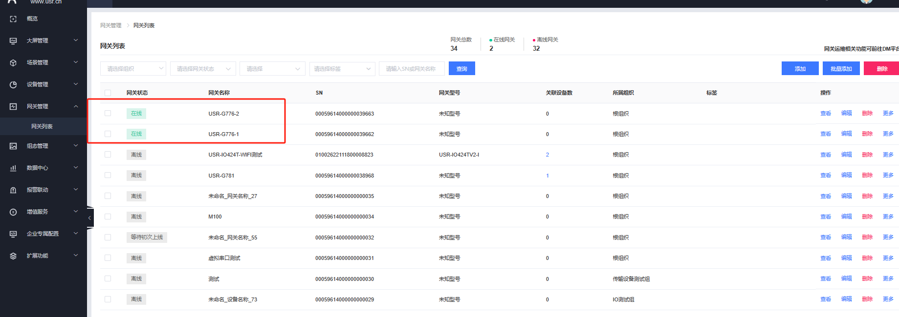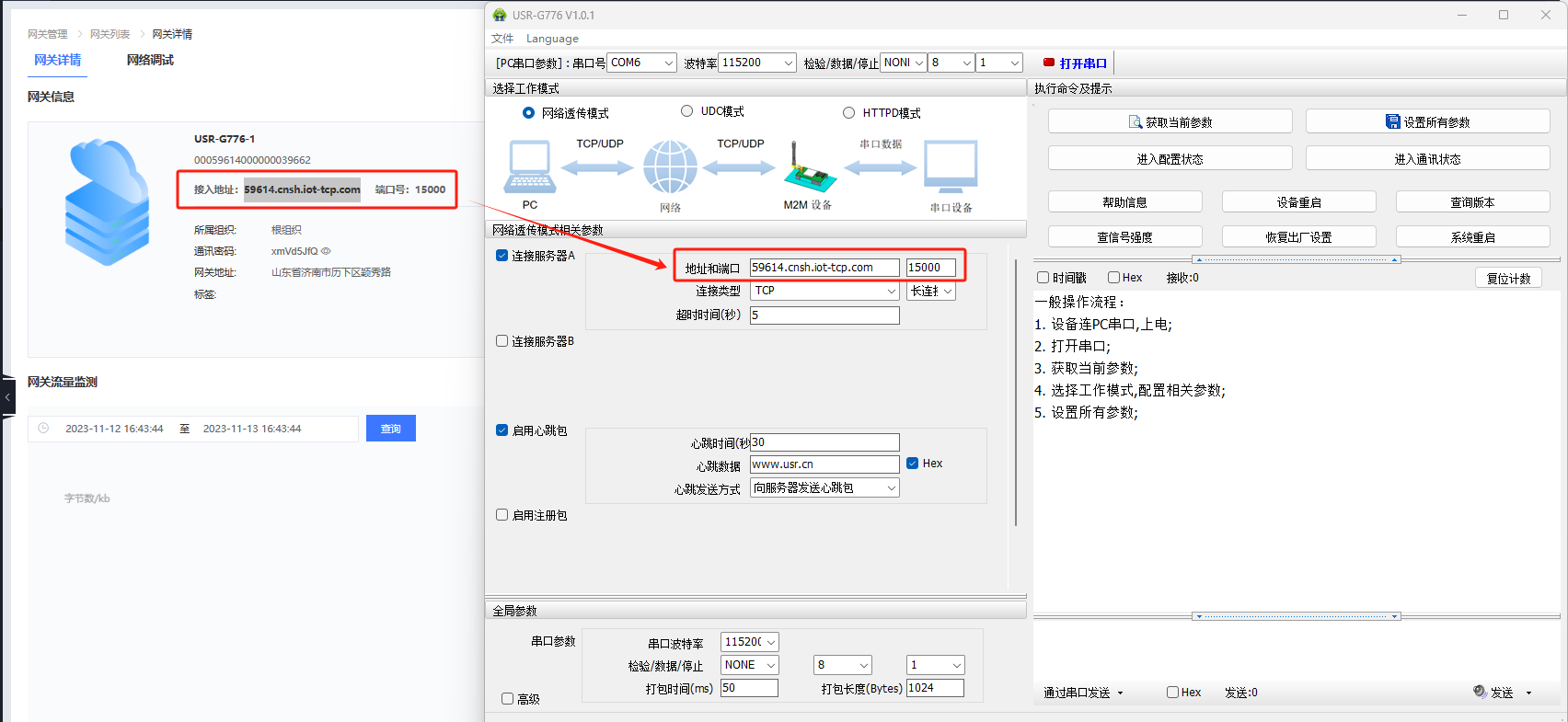 6、有人云打開網(wǎng)關(guān)管理--網(wǎng)關(guān)列表--點(diǎn)“USR-G776-1”的名稱,跳轉(zhuǎn)到網(wǎng)關(guān)詳情頁面,配置軟件上工作模式選擇網(wǎng)絡(luò)透?jìng)髂J?,服?wù)器A填寫有人云平臺(tái)的接入地址和端口