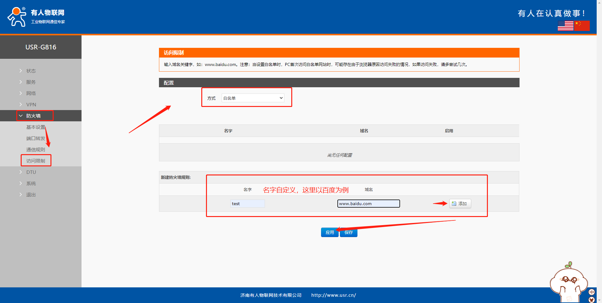 <1>方式選擇黑名單,新建防火墻規(guī)則中名字可自擬,域名即為要禁止的正確域名,點擊添加,然后點擊報保存,規(guī)則立即生效