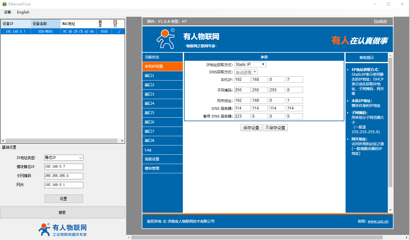 顯示IP 192.168.0.7之后,鼠標(biāo)單擊產(chǎn)品信息,基礎(chǔ)設(shè)置顯示IP類(lèi)型、IP、子網(wǎng)掩碼、網(wǎng)關(guān)信息。