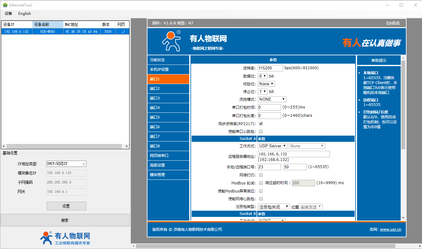 N580 RS485串口做TCP server,電腦下載的串口網(wǎng)絡(luò)助手,左側(cè)用COM口打開(kāi),串口參數(shù)和RS485串口參數(shù)保持一致,波特率、數(shù)據(jù)位、停止位、校驗(yàn)位。右側(cè)用TCP client打開(kāi),服務(wù)器IP填N580的IP,服務(wù)器端口填N580的端口23。