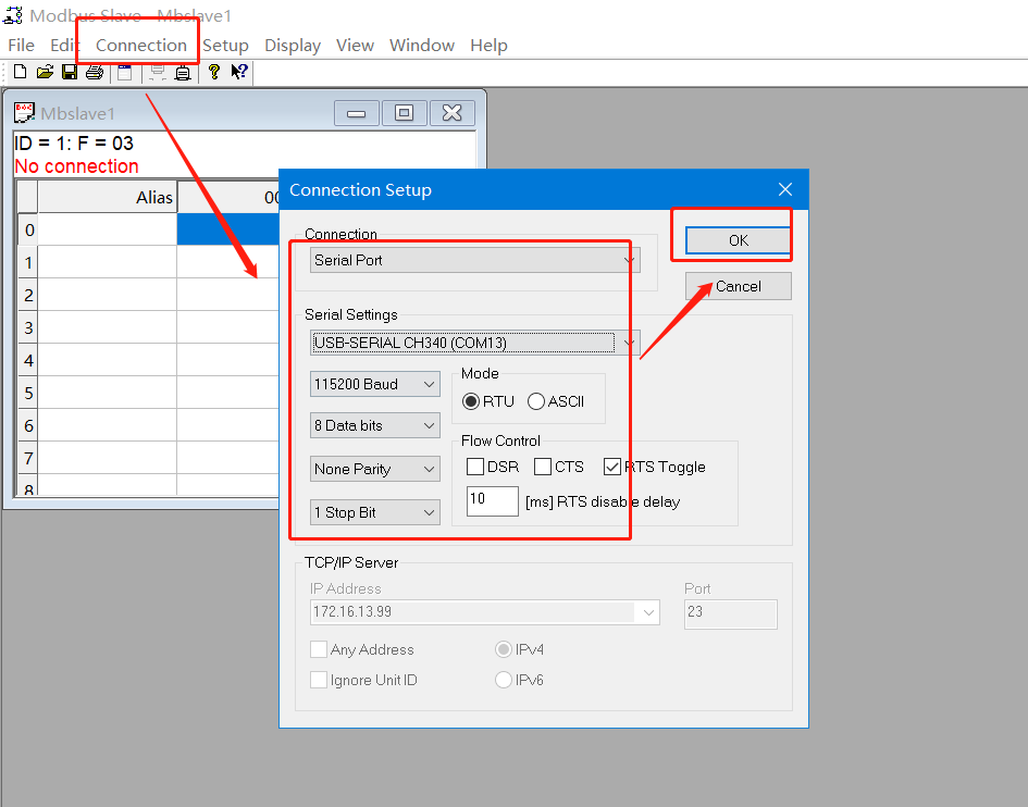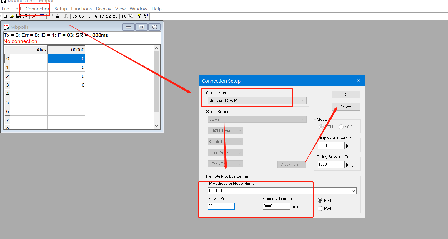 使用 modbus Poll 模擬云端進行查詢,“Connection”--“connect”界面配置連接參數(shù):
