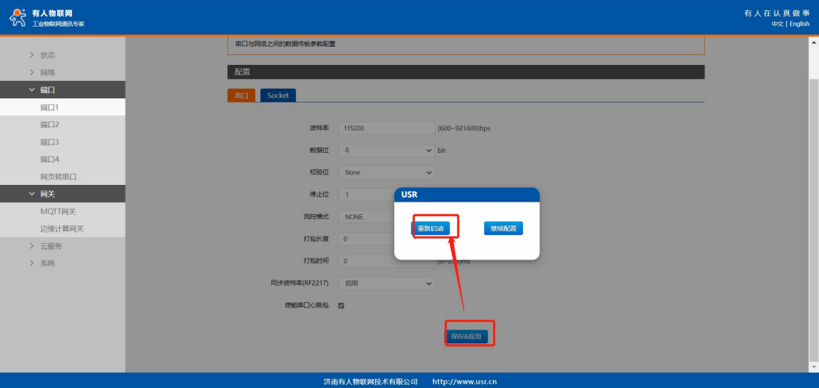 (3) 點擊“保存&應(yīng)用”,會彈出提示框,因此例中所有的配置項均已配置完成,所以點擊“重新啟動”,令配置生效。 設(shè)備中的所有功能,配置完成都需要點擊下方保存按鍵,最終需要重啟后生效。以下不再提示。