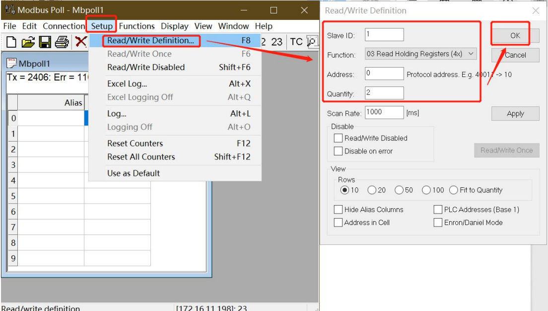 Setup”--“Read/Write Definition”頁面配置目標從機信息: