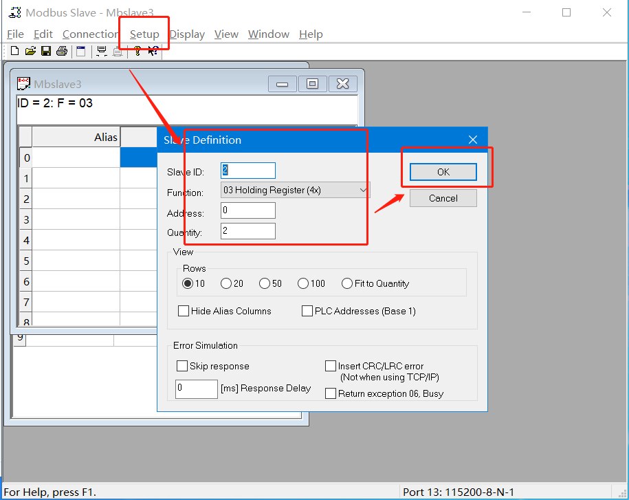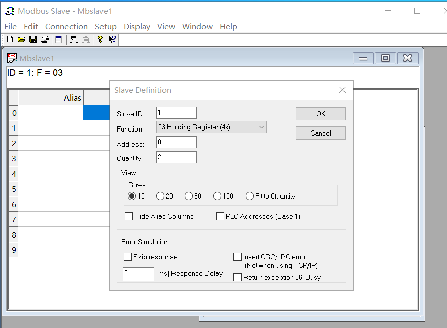 配置從機模擬軟件 “Setup”--“Slave Definition”界面,配置從機信息如下: