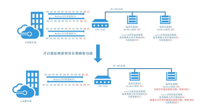 (3)示例:設(shè)備串口 1 下有從機地址為 01、02 兩個從機,01 從機下有一個數(shù)據(jù)點,寄存器地址 01,02 從機下也有一個數(shù)據(jù)點,寄存 器地址 01。若未開啟映射功能,使用 modbus 查詢,需要 01 03 0000 00001、02 03 0000 0001 兩條指令分別查詢。開啟映射功能后, 將 02 從機的從機地址映射為 01、數(shù)據(jù)點寄存器地址映射為 02,即可使用 01 03 0000 0002 一條指令查詢不同從機下的兩個數(shù)據(jù)點。