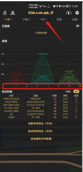 1、可以使用手機下載 cellular-z軟件(手機應用市場均有,也可以百度找一下其他測wifi質(zhì)量的軟件),使用手機wifi掃描當前各wifi信道應用情況,如下圖