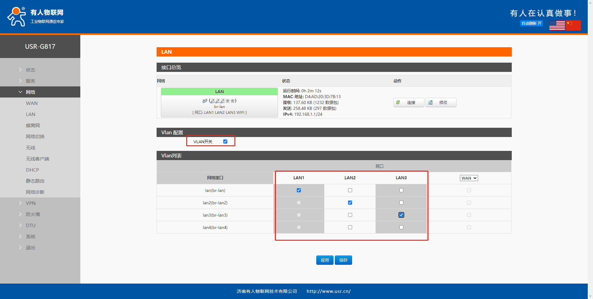 1、進入G817內(nèi)置網(wǎng)頁,進入網(wǎng)絡---LAN--使能VLAN,勾選上則開啟此功能