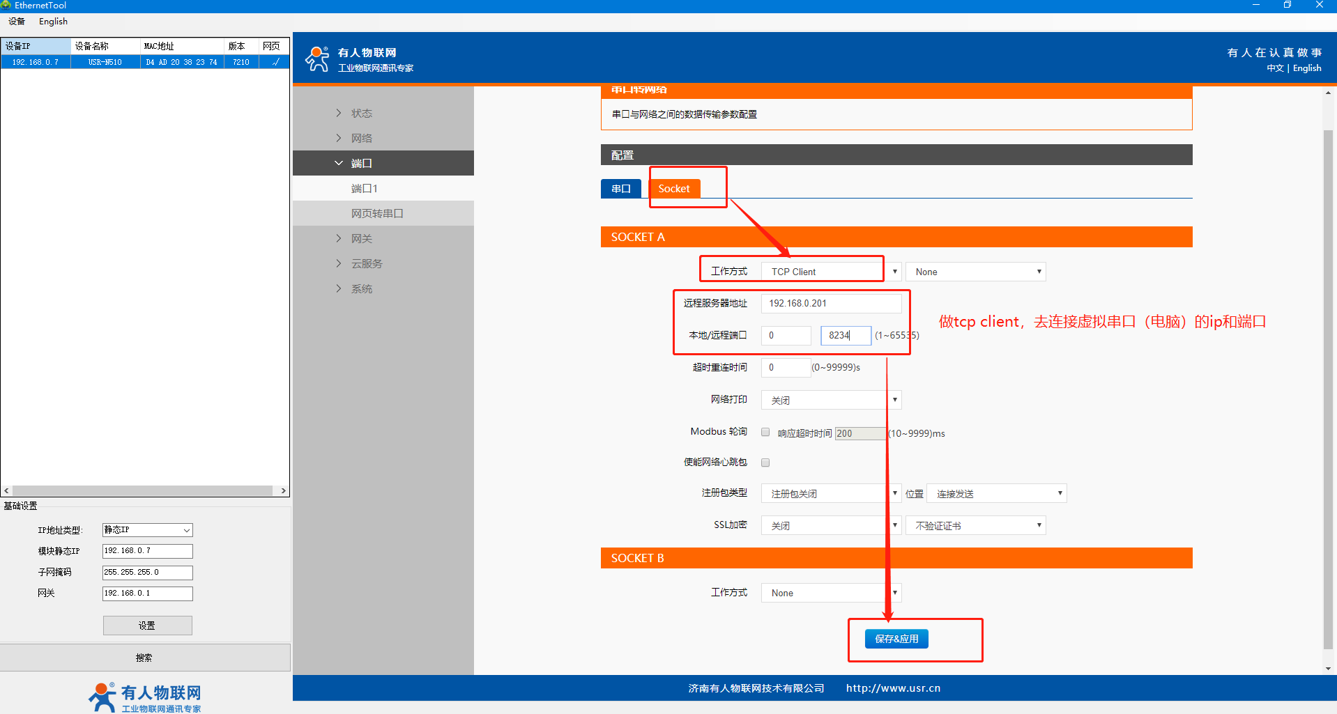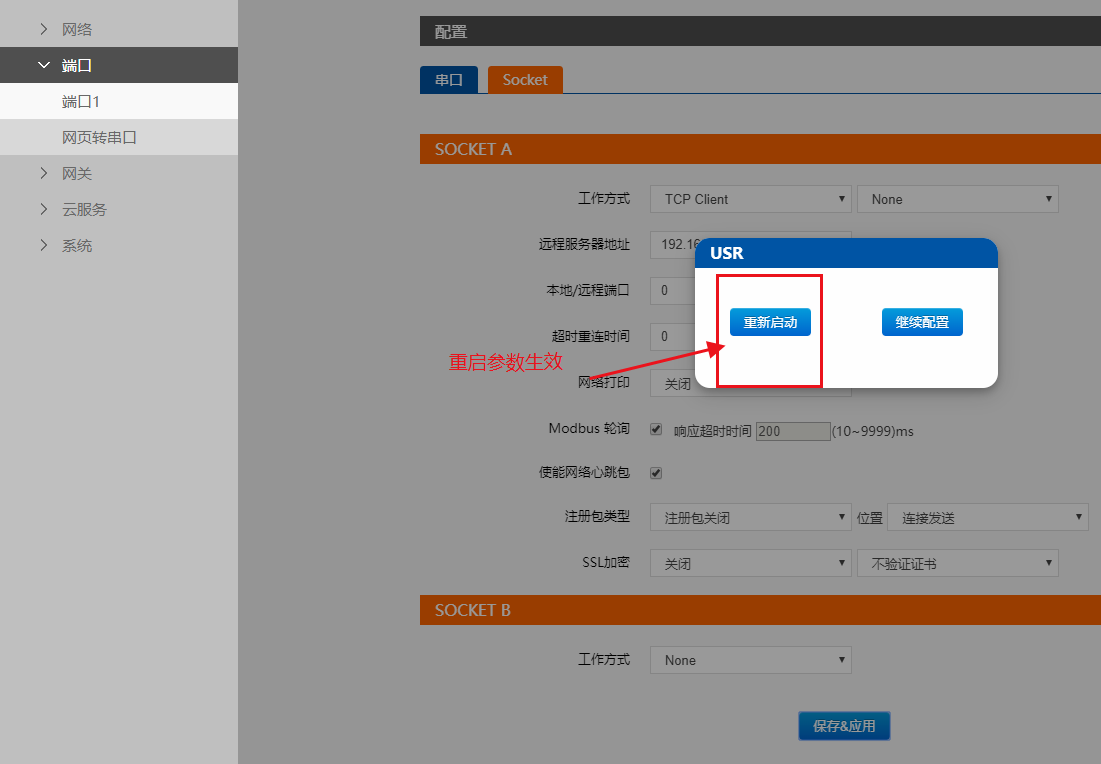 在“端口”>“端口1”界面中的“Socet”配置Socket A的工作模式為“TCP Client”