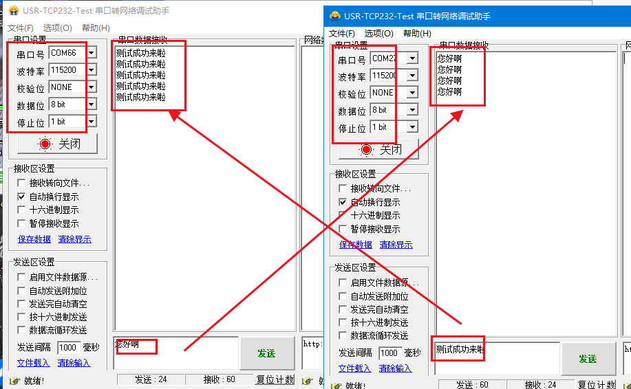 9、使用串口工具打開虛擬串口與N510真實(shí)串口,便可實(shí)現(xiàn)網(wǎng)絡(luò)串口與真實(shí)串口之間的相互通信。