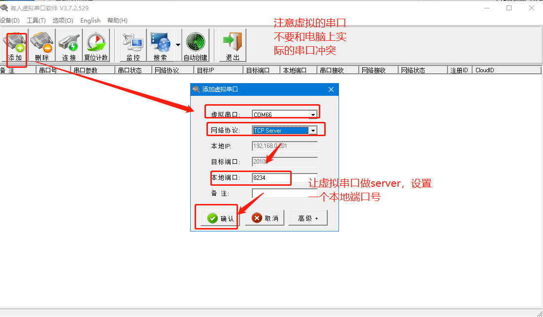 5、打開下載的虛擬串口軟件,創(chuàng)建虛擬串口。選擇一個(gè)電腦設(shè)備管理器中不存在的一個(gè)串口號(hào)COM66, 自定義一個(gè)TCP端口:8234,點(diǎn)擊確定,電腦上會(huì)出現(xiàn)虛擬的COM口號(hào)。