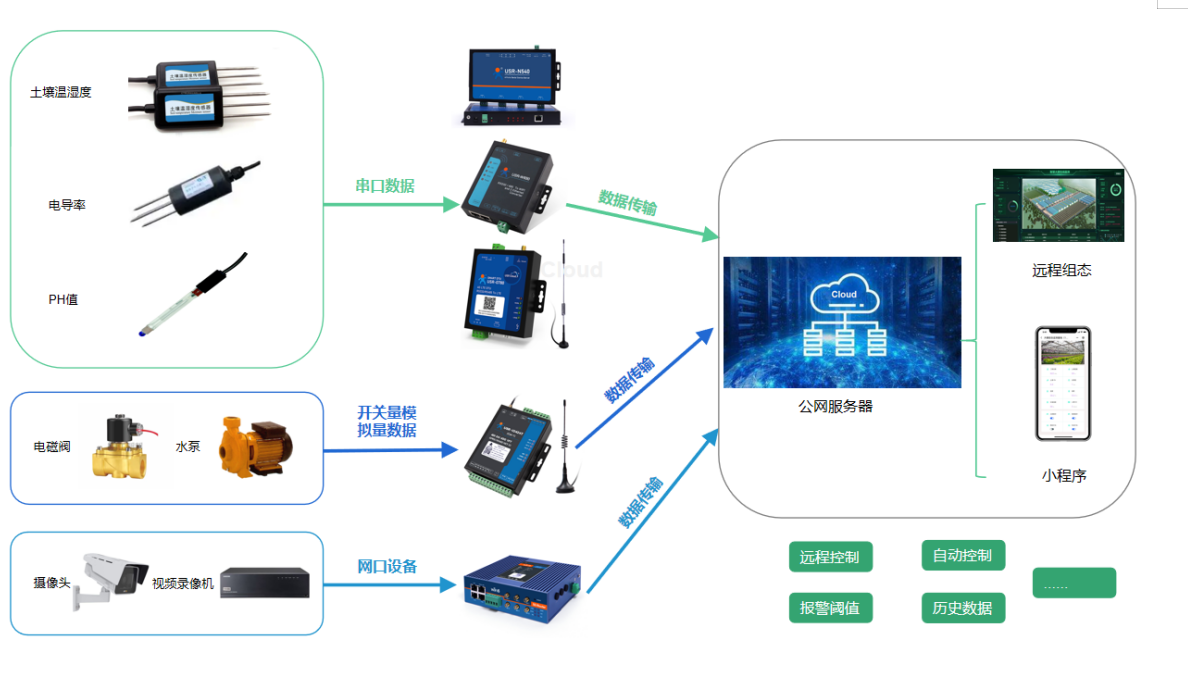 v 若現(xiàn)場終端設備為串口設備,可以通過串口服務器、wifi串口服務器或DTU將數(shù)據(jù)傳輸至遠程服務器顯示。若現(xiàn)場有4G信號時可選用DTU進行數(shù)據(jù)傳輸;若方便布線可選用串口服務器;若現(xiàn)場有wifi覆蓋可選用wifi串口服務器;