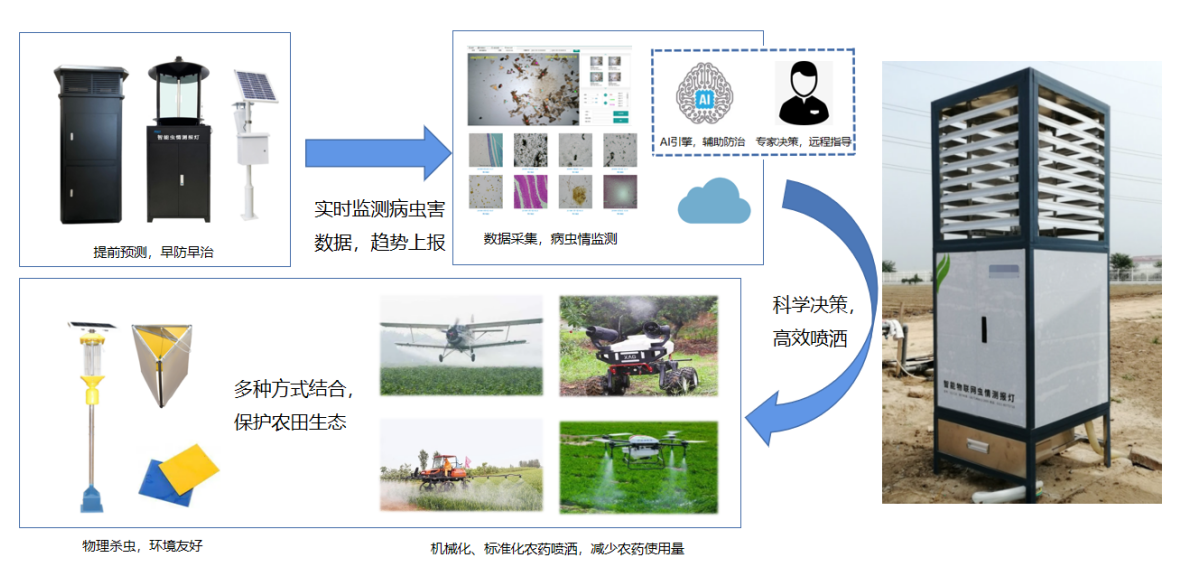 通過蟲情測報(bào)燈、智能孢子捕捉儀等智能儀器實(shí)時(shí)監(jiān)測病蟲害情況,實(shí)時(shí)上報(bào)高清圖片,平臺(tái)通過AI圖像識(shí)別進(jìn)行實(shí)時(shí)判斷,預(yù)測病蟲害發(fā)生情況,及時(shí)提醒,科學(xué)指導(dǎo)農(nóng)藥配撒,減少損失;
