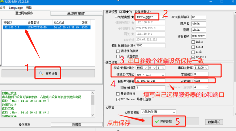需要把T0模塊的ip改成DHCP獲取,或者改成與交換機(jī)同網(wǎng)段的靜態(tài)ip。把串口參數(shù)、ip端口填好后,點(diǎn)擊保存參數(shù),才能生效。