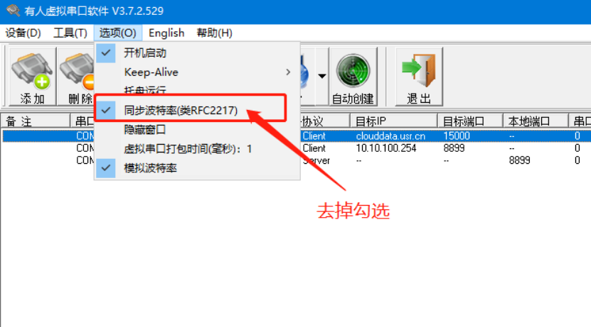 點擊“選項”,取消勾選“同步波特率(類RFC2217)”即可。本功能默認(rèn)為開啟。