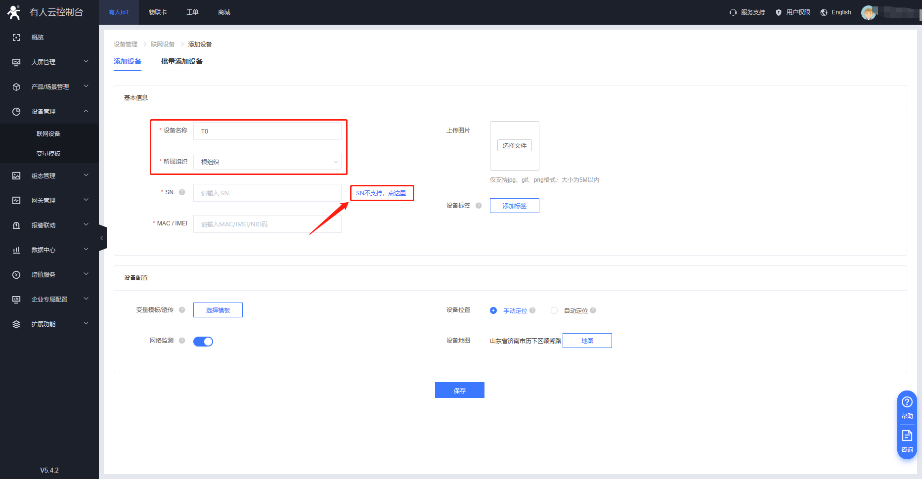 2)T0目前不支持SN碼添加,點擊右側(cè)“沒有SN,點這里”,設(shè)備ID和通訊密碼可以自動生成,設(shè)備ID20位,通訊密碼必須是8位(支持修改密碼)。