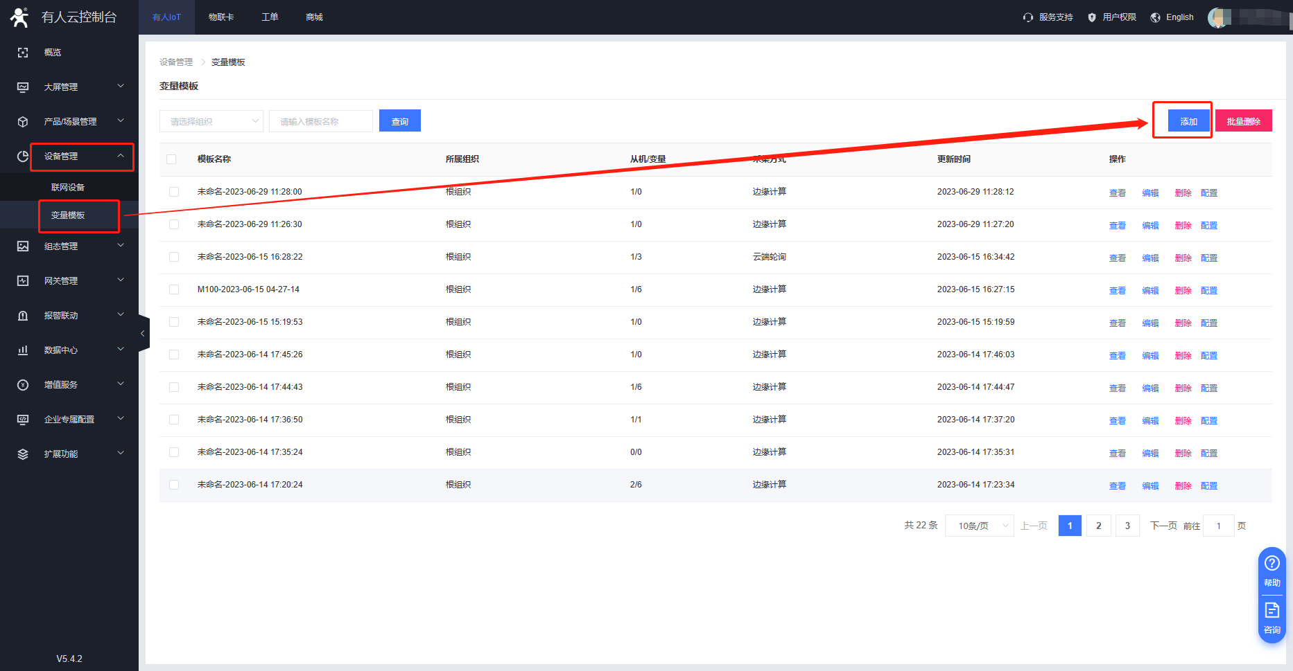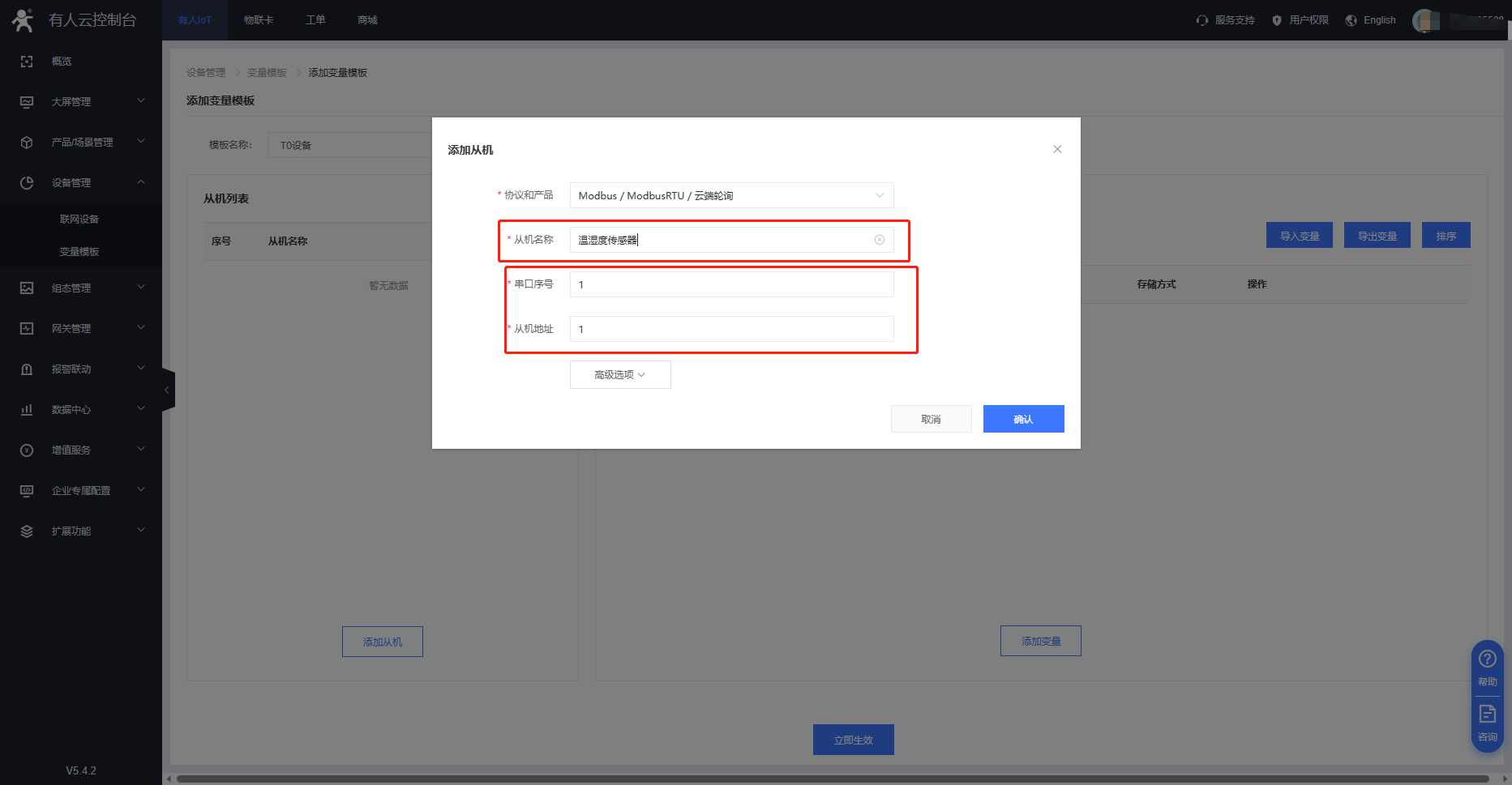 1)點擊“添加”,采集方式選擇“云端輪詢”,模板名稱可以自定義,點擊“下一步,配置從機和變量”