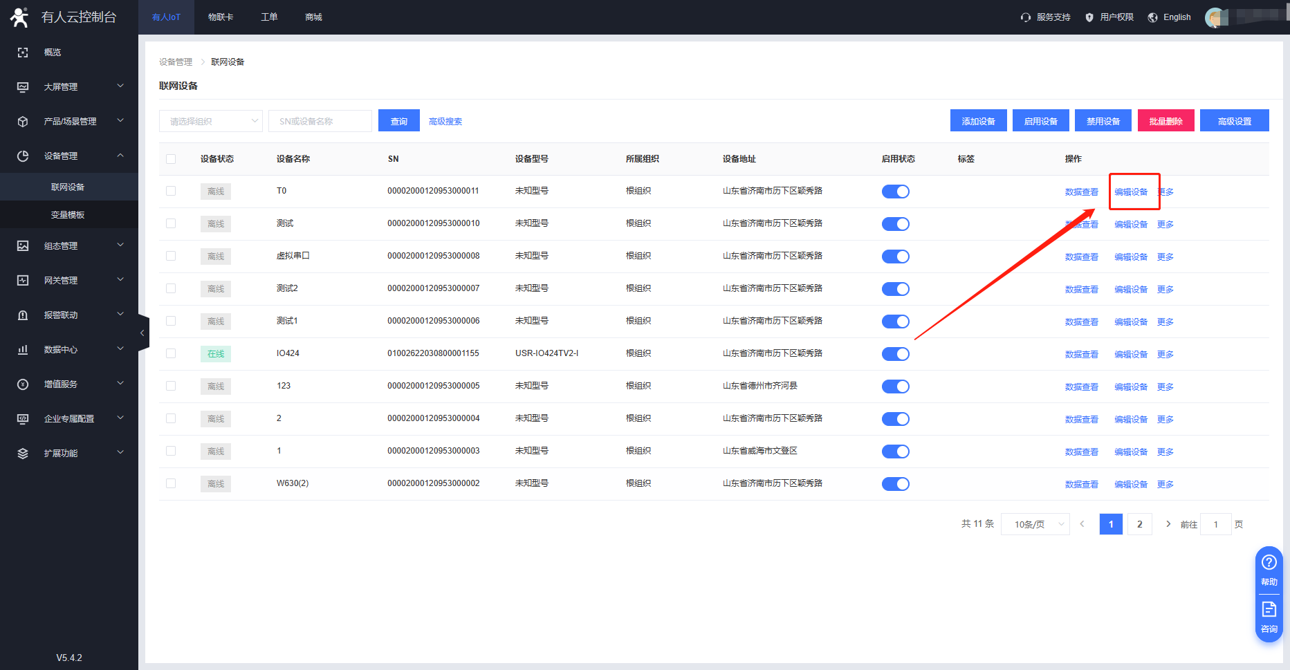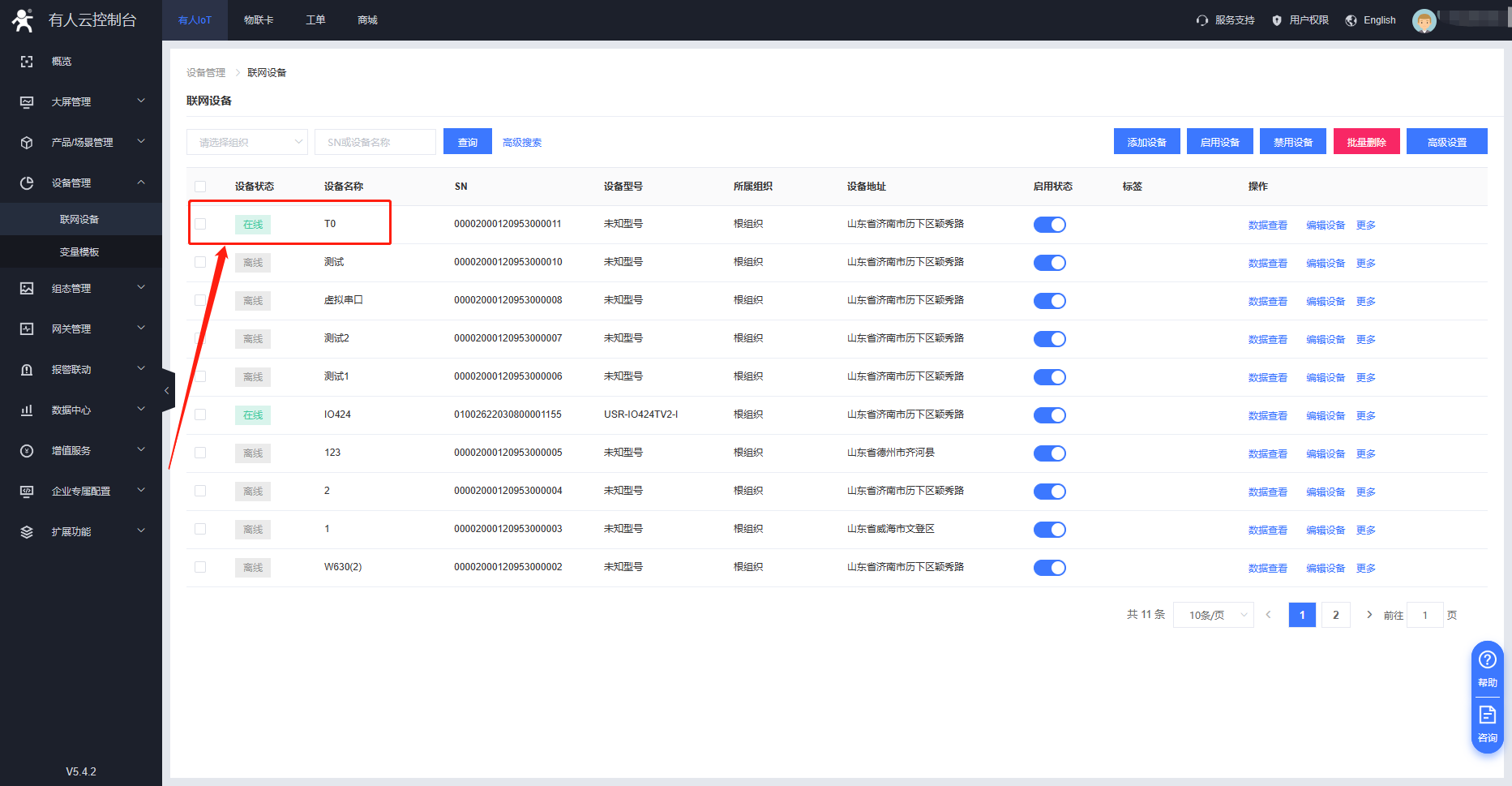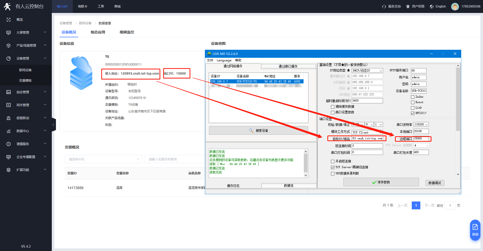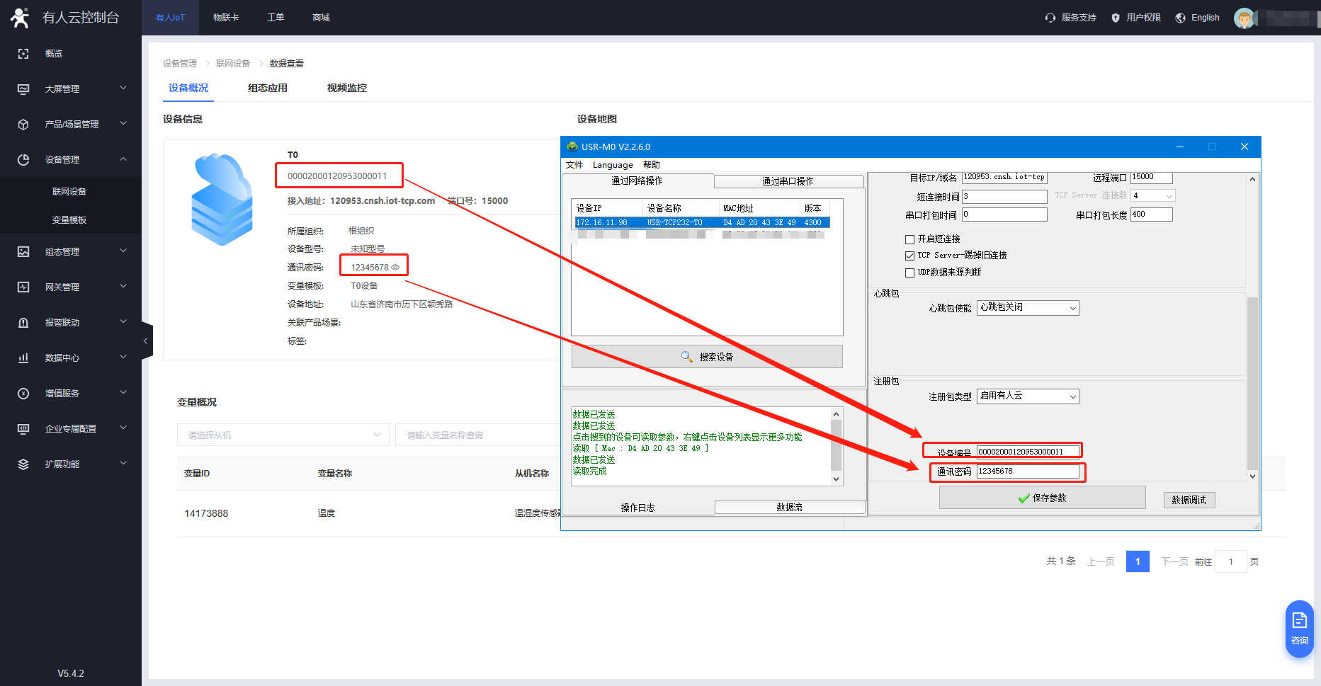 3.T0正常聯(lián)網(wǎng),參數(shù)設(shè)置正確,此時可以看到有人云設(shè)備已經(jīng)上線