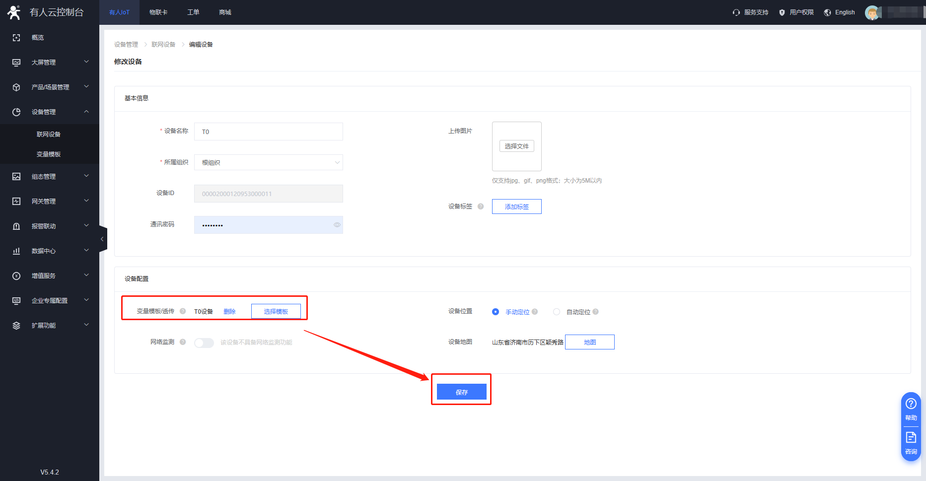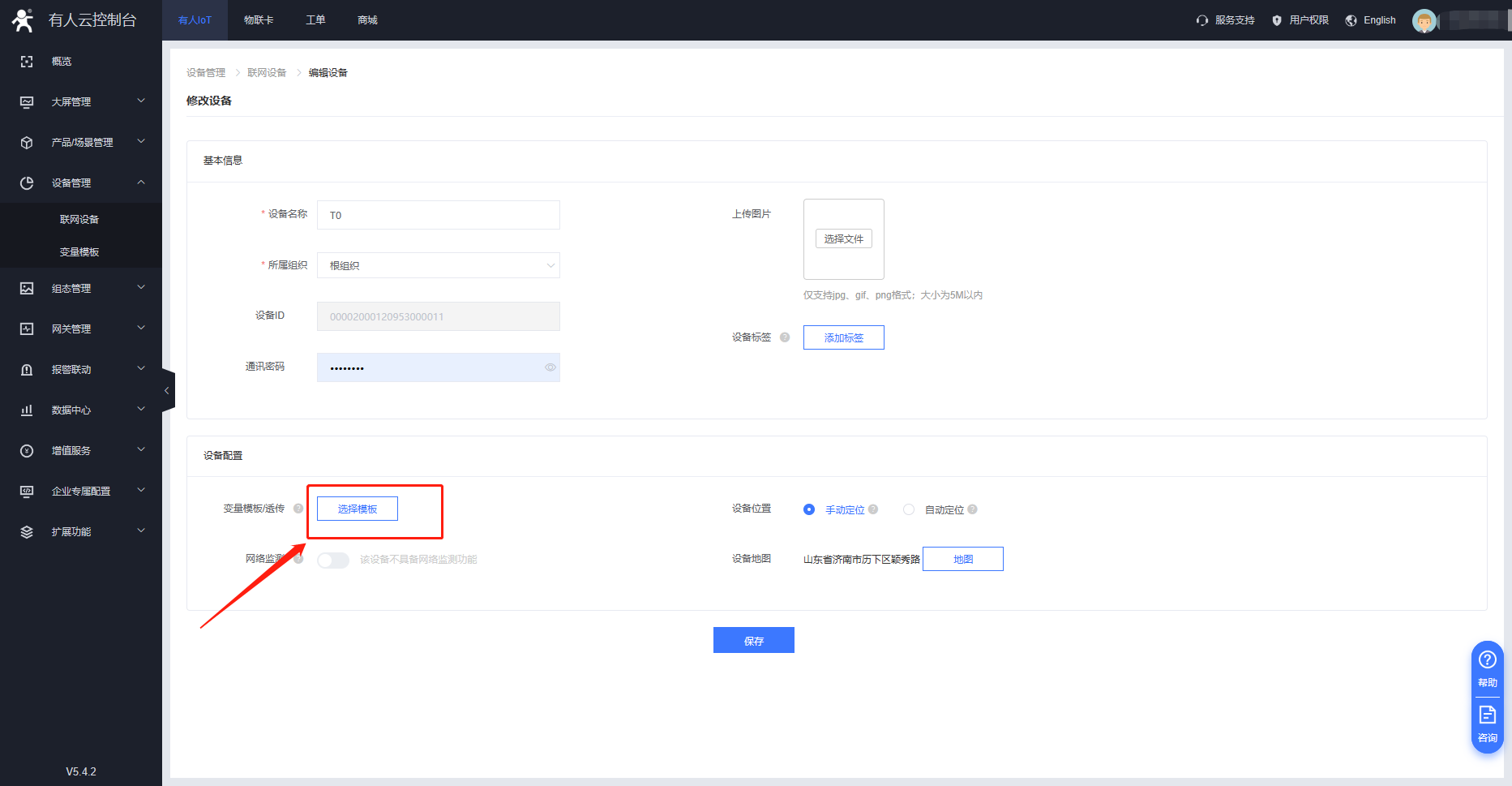4.打開剛剛添加的設(shè)備,點擊“編輯”,點擊“選擇模板”,然后確定,在“已有模板”里選擇剛剛創(chuàng)建的模板,確定添加后保存
