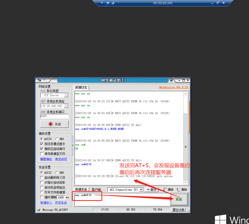 4)發(fā)送修改指令之后,要下發(fā)一個AT+S,同樣以ASCII形式下發(fā),且AT指令最后要加回車換行。此指令為保存重啟,設(shè)備重啟后修改的參數(shù)才會生效