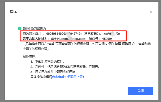 設(shè)備名稱可自定義,所屬組織選擇根組織,T1目前不支持SN碼添加,點(diǎn)擊右側(cè)“沒有SN,點(diǎn)這里”,設(shè)備ID和通訊密碼可以自動(dòng)生成,設(shè)備ID20位,通訊密碼必須是8位(支持修改密碼),開啟有人云透傳。設(shè)置完成后點(diǎn)擊保存即可看到平臺(tái)給分配的接入地址和SN 密碼等信息。