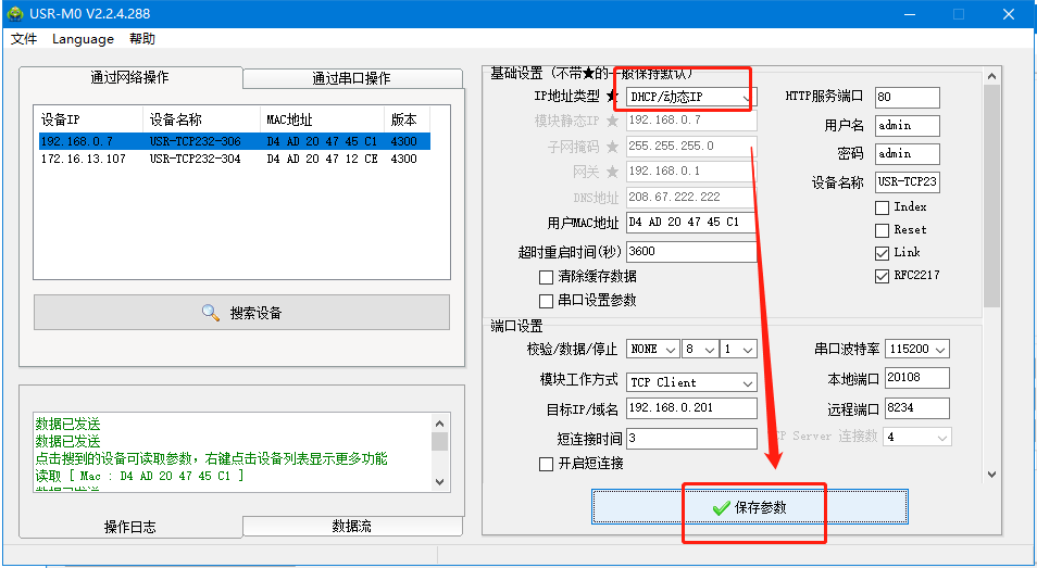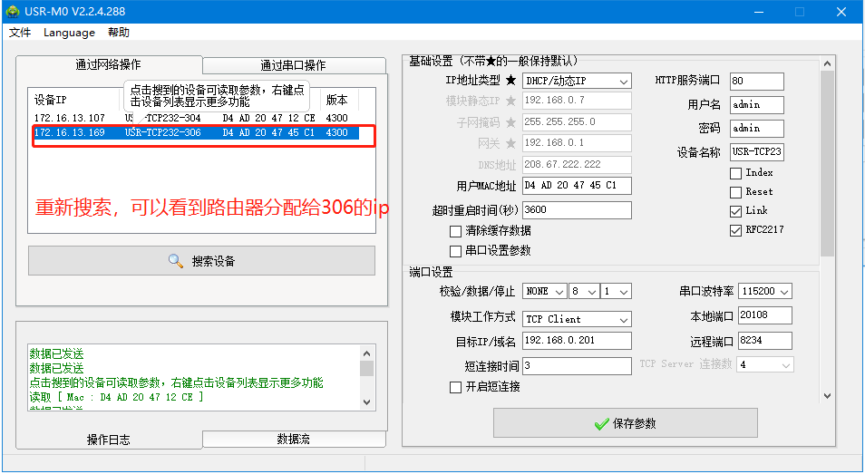 306和電腦都接到同一個路由器上,用M0軟件搜索到306,出廠默認ip是192.168.0.7,雙擊顯示右邊參數(shù),ip選擇動態(tài)獲取,保存參數(shù),重新搜索,可以看到路由器分配給給306的ip。