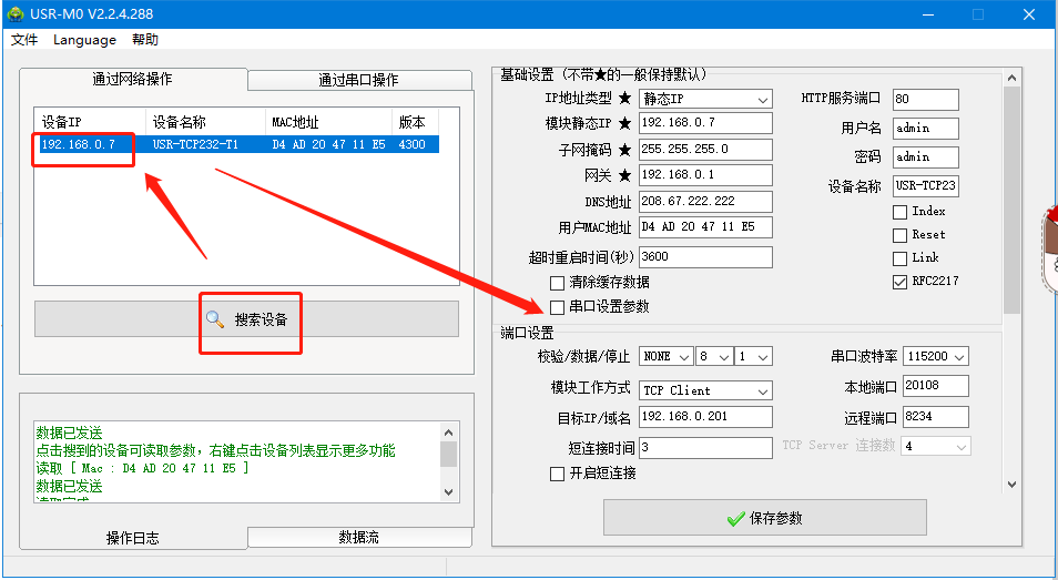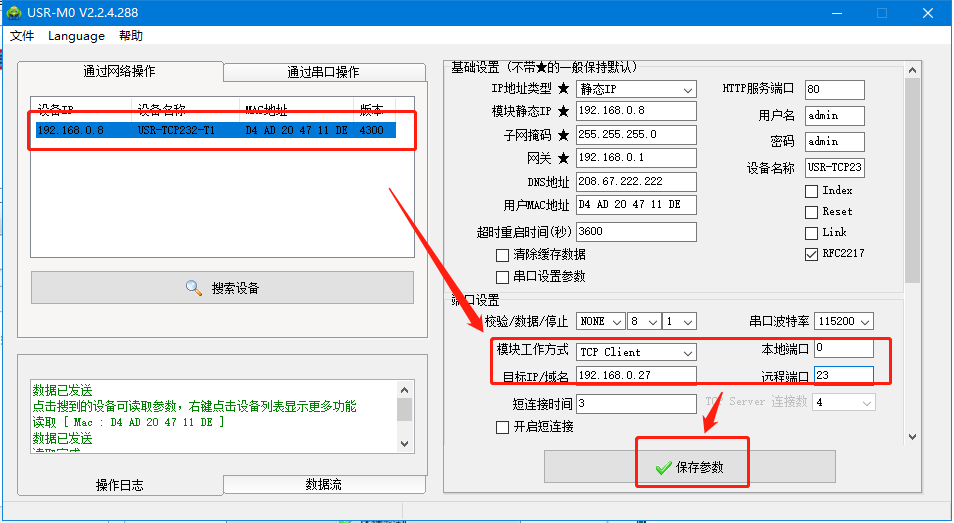 用M0設(shè)置軟件搜索設(shè)備,獲取T1 的IP參數(shù),點(diǎn)擊T1的IP,將T1的IP設(shè)置192.168.0.8,工作方式TCP client,本地端口 0,遠(yuǎn)程端口23,目標(biāo)IP 192.168.0.7,點(diǎn)擊保存參數(shù)