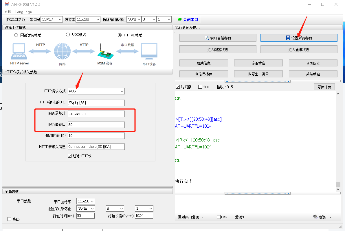 2、點擊HTTPD模式,配置服務(wù)器的信息。設(shè)置HTTP請求方式為post,HTTP服務(wù)器地址:test.usr.cn, HTTP服務(wù)器端口號為80,HTTP報頭路徑為/2.php?設(shè)置完成后點擊設(shè)置并保存所有參數(shù)。最后點擊進入通訊狀態(tài)。
