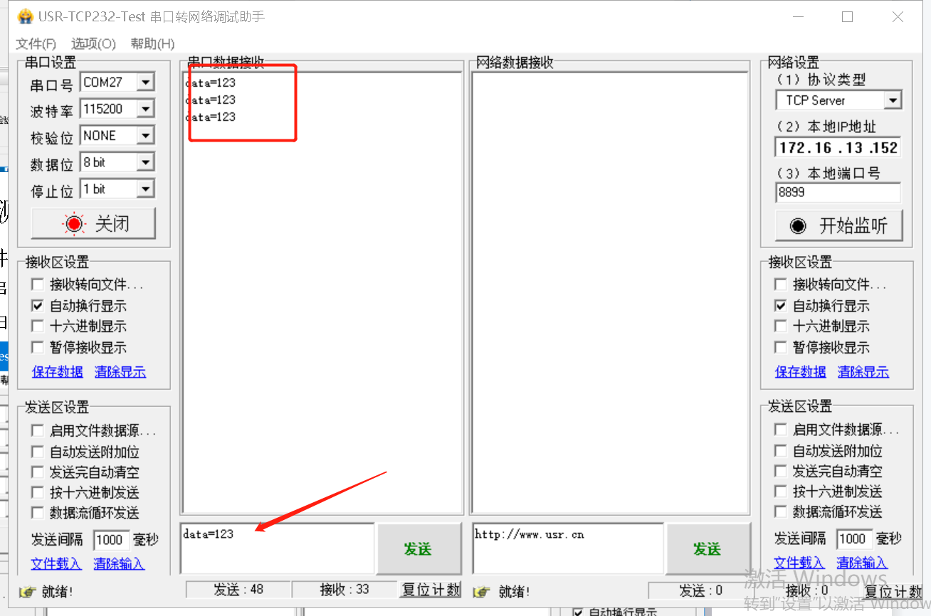 安裝測試軟件(建議關(guān)閉電腦的防火墻以及殺毒軟件)使用設(shè)備在電腦端生成的com口,用設(shè)備默認的串口參數(shù)打開串口,在串口段發(fā)送數(shù)據(jù):data=123可以看到服務(wù)器返回值data=123。由此成功建立httpd client測試。