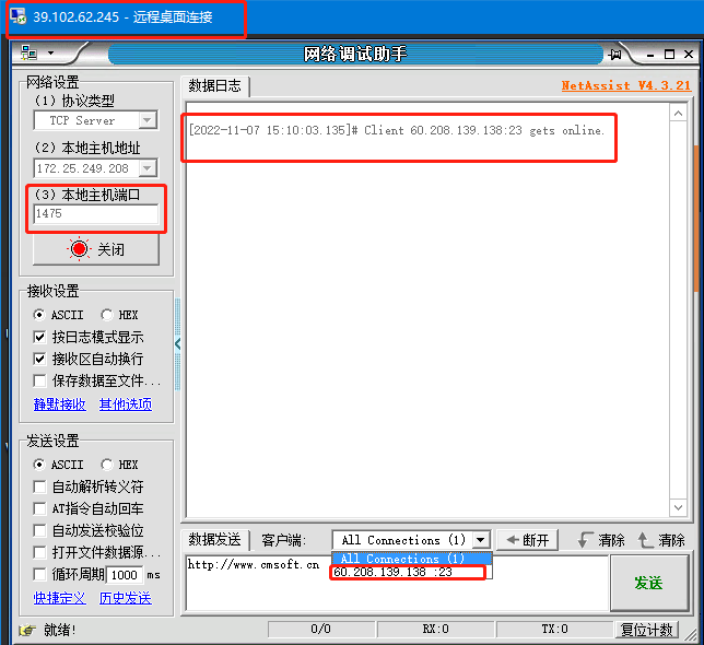 4. 接下來把S1模塊的網(wǎng)口接到可以上外網(wǎng)的交換機(jī)或者路由器上,將電腦接入相同的交換機(jī)路由器,在服務(wù)器上打開一個(gè)監(jiān)聽端口的網(wǎng)絡(luò)助手進(jìn)行測(cè)試,如下圖會(huì)顯示連接成功。