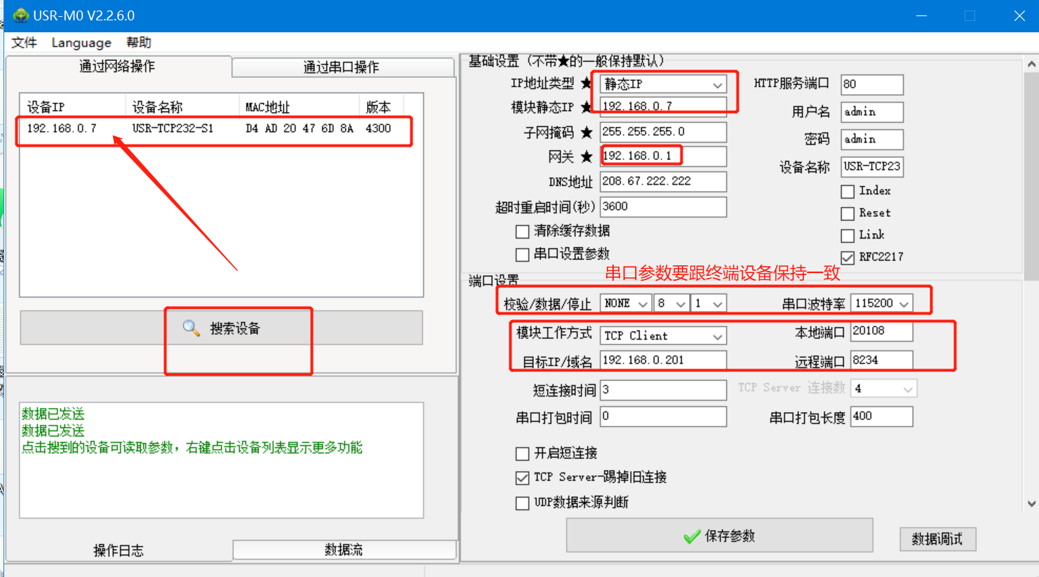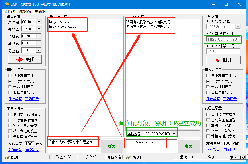 將軟件串口設(shè)置中的串口號配置為COM9。由于設(shè)備默認(rèn)協(xié)議類型為TCP client,所以電腦端需要設(shè)置為TCP server, IP和端口號為模塊的目標(biāo)IP:192.168.0.201和目標(biāo)端口號:8234。 顯示連接對象,證明連接成功。此時從串口助手(com9)發(fā)送數(shù)據(jù),網(wǎng)絡(luò)助手可以收到;從網(wǎng)絡(luò)助手發(fā)數(shù)據(jù),串口助手也能收到。