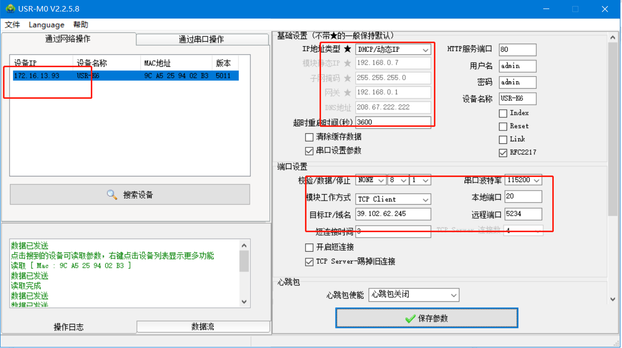 4. IP地址類型更改為DHCP/動(dòng)態(tài)IP,工作方式選擇TCP Client,目標(biāo)IP:39.102.62.245(我司測(cè)試線上服務(wù)器),遠(yuǎn)程端口號(hào):5234,設(shè)置完成后點(diǎn)擊保存參數(shù)。