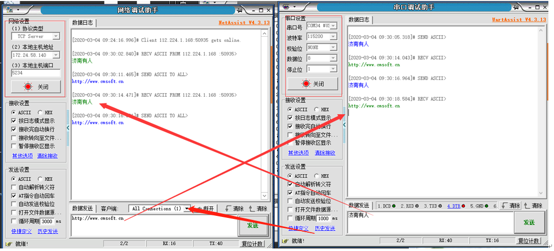 2. 數(shù)據(jù)流向:串口調(diào)試助手軟件---USR-K6-----遠(yuǎn)程服務(wù)器