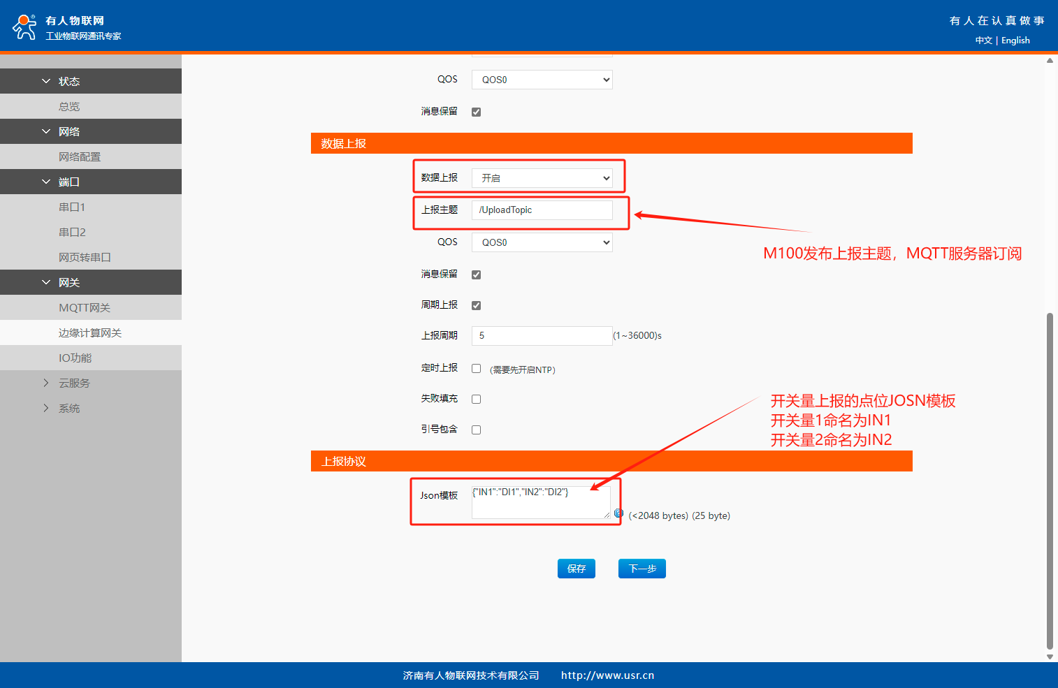 數(shù)據(jù)上報(bào)中開(kāi)啟數(shù)據(jù)上報(bào)功能,設(shè)置上報(bào)主題,JOSN模板中定義要上報(bào)的開(kāi)關(guān)量信息