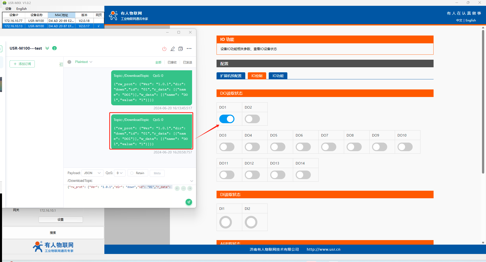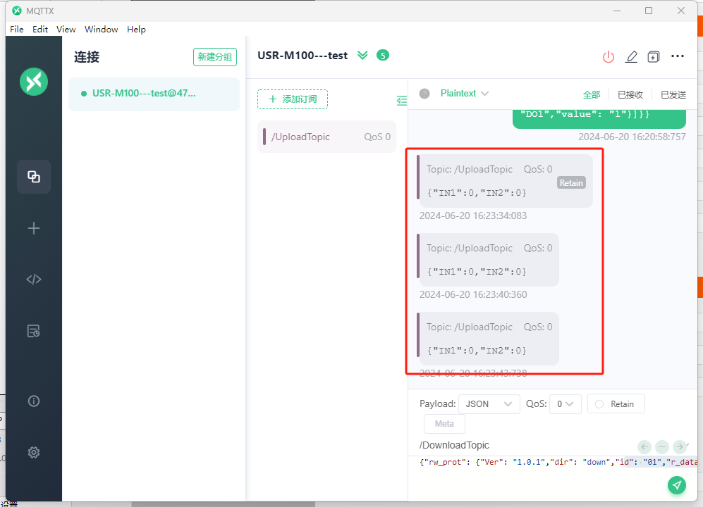 MQTTX下發(fā)控制DO動(dòng)作吸合,注意主題