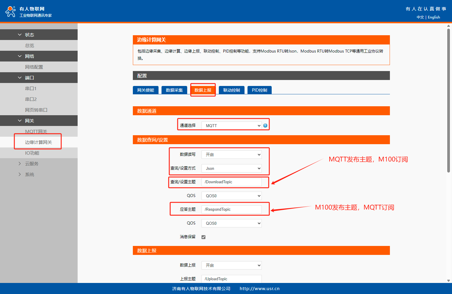 數(shù)據(jù)上報(bào)通道選擇MQTT,數(shù)據(jù)查詢(xún)?cè)O(shè)置中開(kāi)啟讀寫(xiě)功能,設(shè)置發(fā)布主題和訂閱主題