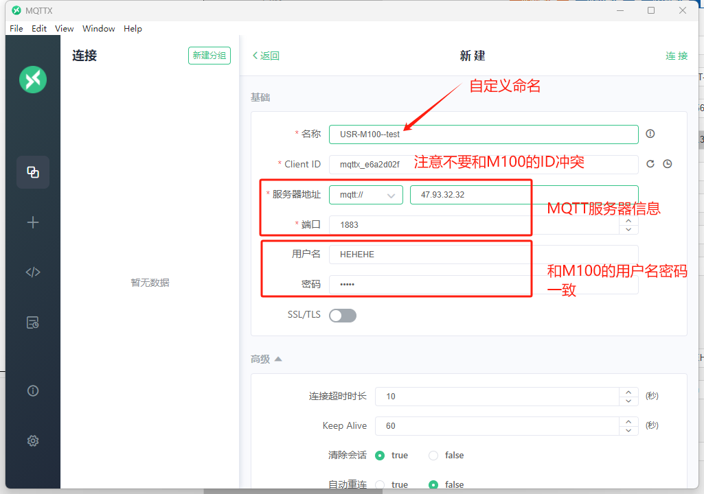 打開(kāi)MQTTX軟件,新建一個(gè)連接,自定義連接名名稱(chēng),可以使用軟件生成的Client ID,注意不要和MQTT沖突即可,填入MQTT服務(wù)器信息,填入用戶(hù)名密碼。,點(diǎn)擊右上角連接。