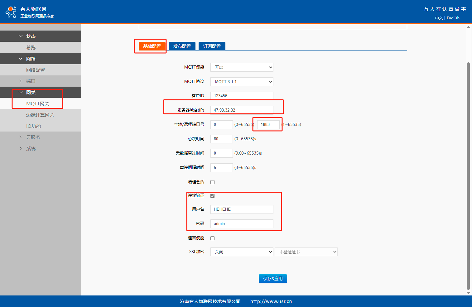 5、MQTT網(wǎng)關(guān)參數(shù)設(shè)置,開(kāi)啟MQTT使能,客戶(hù)ID自定義,填入MQTT服務(wù)器信息(此為測(cè)試服務(wù)器,正式使用時(shí),不可以使用此服務(wù)器),連接驗(yàn)證用戶(hù)名密碼自定義。保存應(yīng)用,繼續(xù)配置。