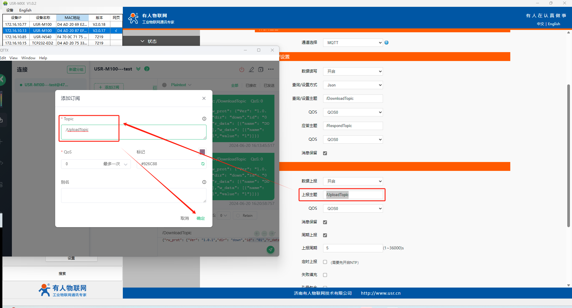 添加訂閱主題,訂閱上M100的上報(bào)主題